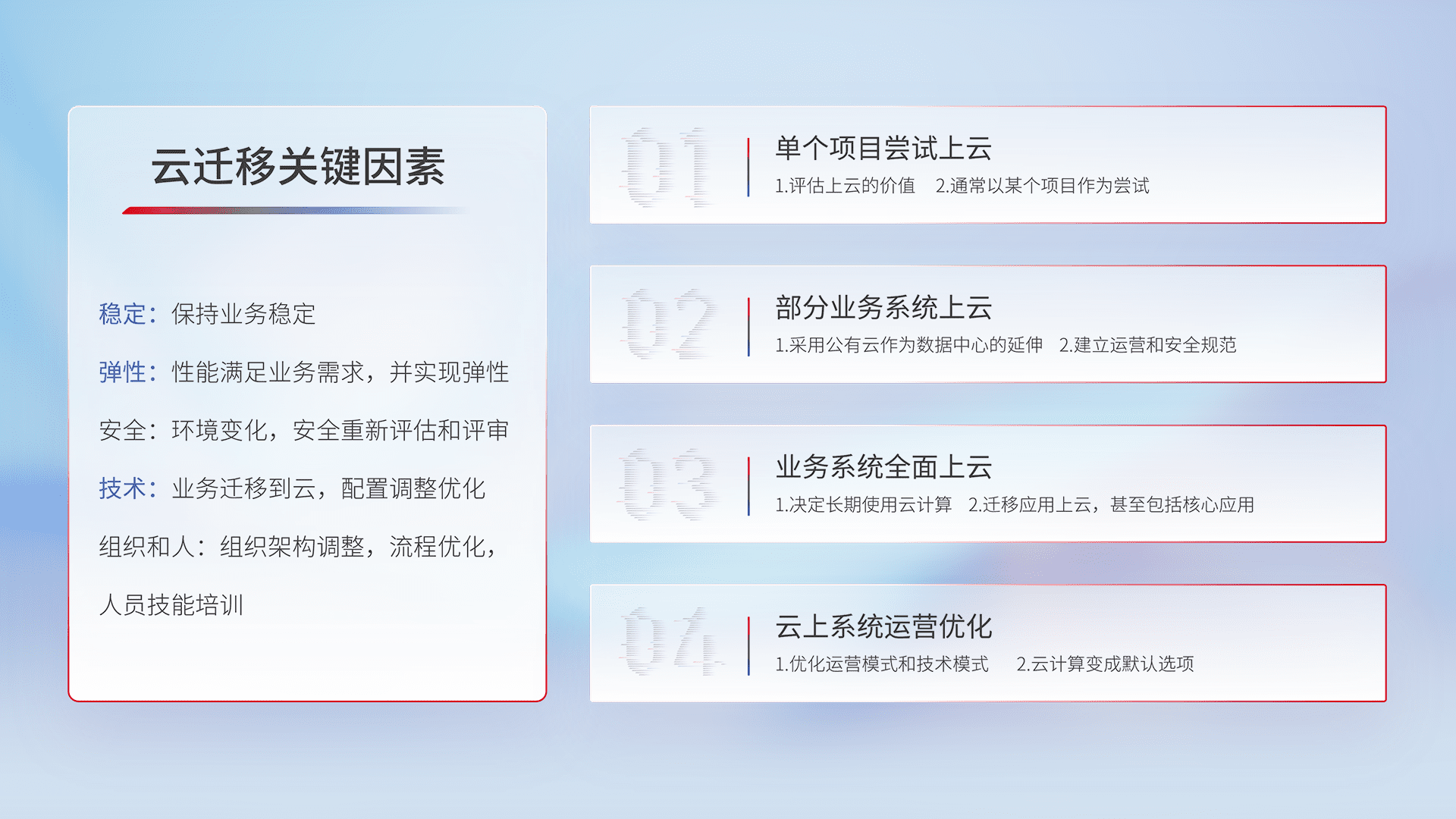 结合实际业务,,从规划设计、、、、云平台选型、、云原生改造、、数据迁移、、集成交付,,迁移全过程为客户识别最佳上云路径,,,,做好风险识别管理,,设计网络架构、、身份权限、、、、安全审计合规、、操作审计、、、、日志审计、、监控告警策略、、、、多站点容灾设计等,,,,对云上基础设施进行整体规划,,提升IT治理水平,,以满足弹性、、、高可用、、高性能的需求。。。。