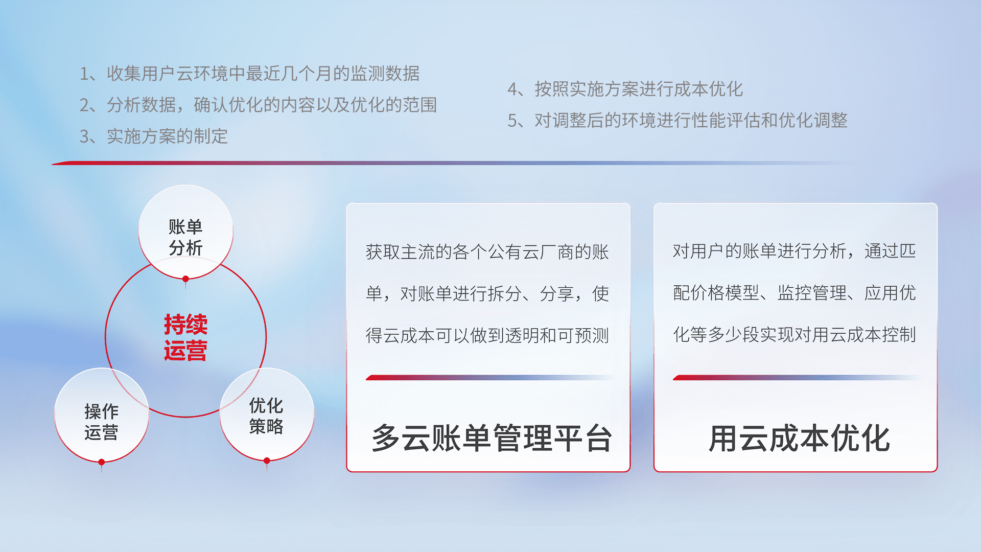 通过多云纳管,,,,以统一的资源数据模型把客户的云资源进行抽象和封装,,,进而实现对多云资源的统一操作,,保障云资源管理的可靠性、、稳定性与可用性。。。。量身定制化运维内容,,配置、、、、开发运维、、、、补丁管理、、备份、、、、监控、、认证和访问管理、、、审计和日常巡检等,,,保障在用云过程中的可靠度,,,稳定度以及高可用率。。。。